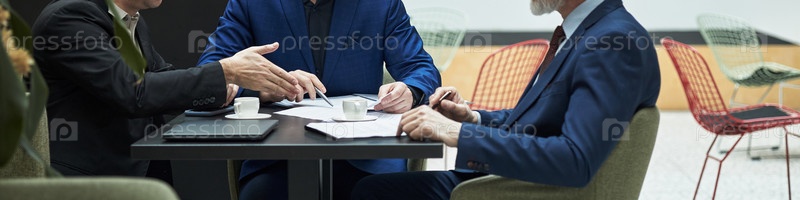 Бизнес-профессионалы, рассматривающие контракты в современном офисе