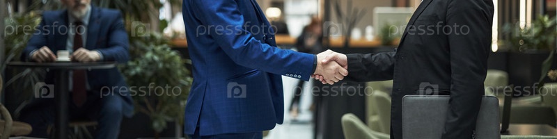 Бизнесмены пожали друг другу руки в современной офисной среде