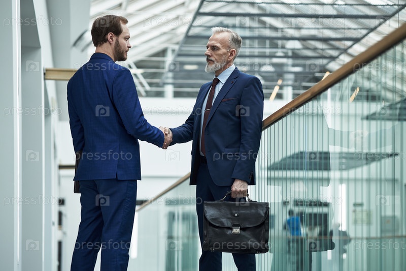 Бизнесмены пожали друг другу руки в современном офисном здании