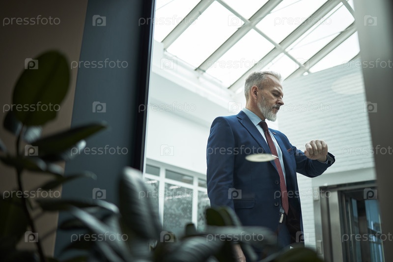 Профессиональный бизнесмен, ищущий наручные часы в офисе