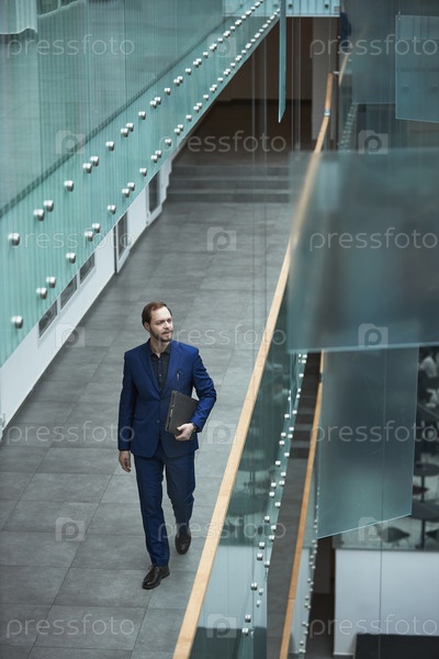 Бизнесмен ходит по современному офисному коридору, держащий ноутбук