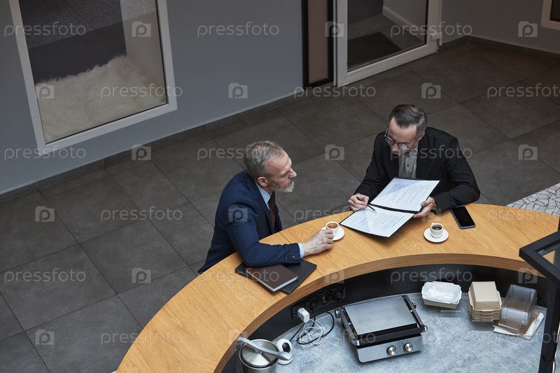 Два бизнесмена участвуют в дискуссии по поводу документов в кафетерии