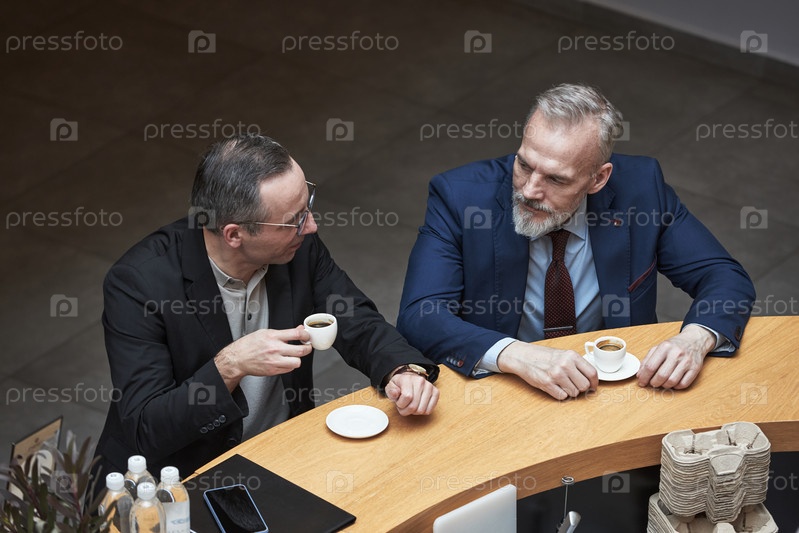 Деловые коллеги обсуждают проект на стойке офисной кафетерии