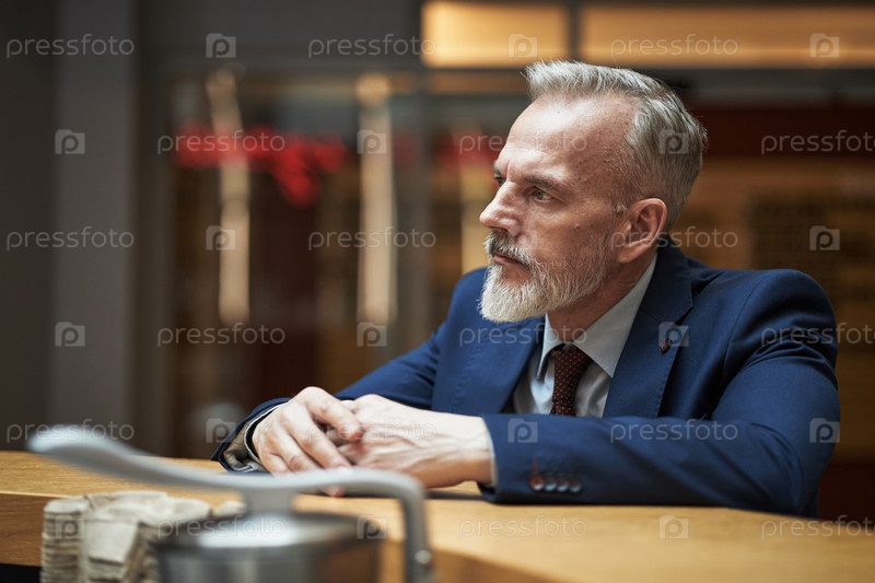 Отражение бизнесмена, опирающегося на стол в офисной обстановке