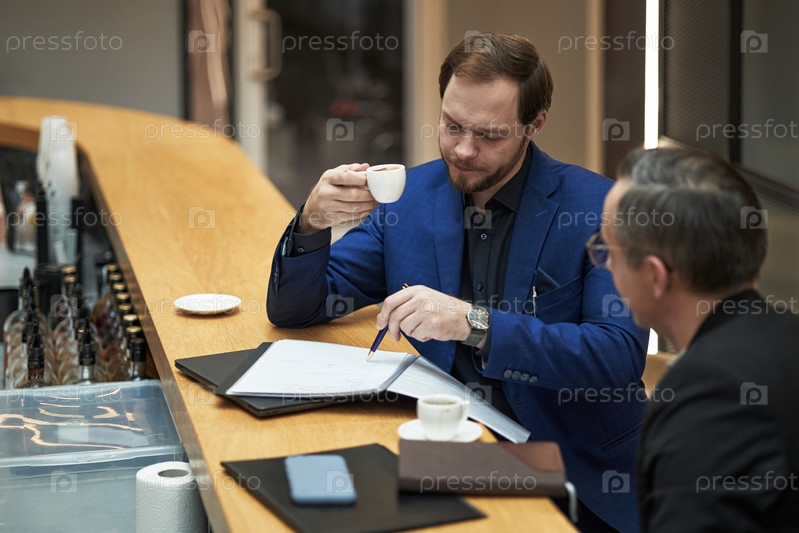 Менеджеры обсуждают бизнес за чашкой кофе в современной офисной обстановке
