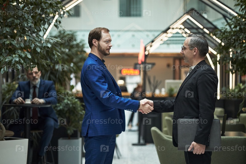 Два бизнесмена пожали друг другу руки в современном офисном лобби