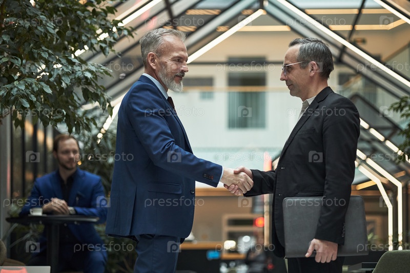Зрелые бизнесмены, пожавшие руки в современной офисной обстановке