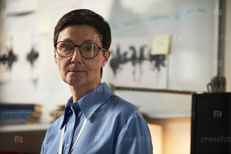 Портрет женщины среднего возраста, стоящей в тюремном офисе