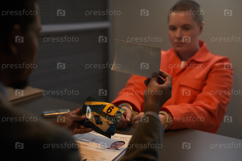 Молодая взрослая женщина в тюремной форме допрашивается следователем