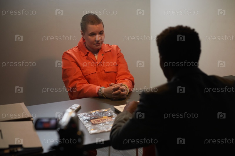 Молодая женщина в наручниках сидит напротив чернокожего во время допроса
