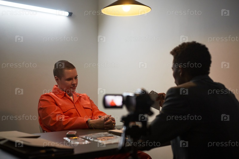 Молодая женщина в тюремной форме допрашивается чернокожим следователем