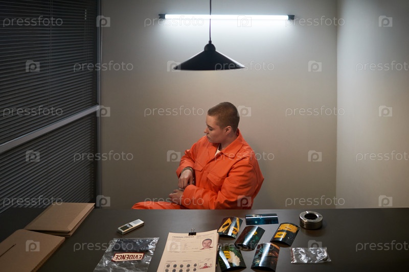 Молодая взрослая женщина сидит в комнате допросов, нося тюремную форму