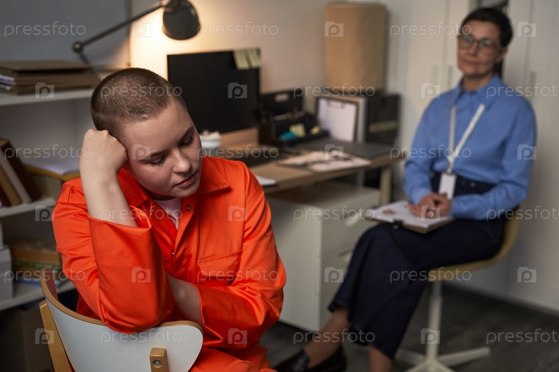Молодая женщина в тюремной форме сидит в офисе и чувствует себя подавленно