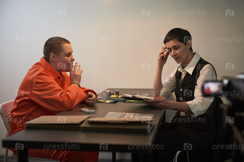 Молодая женщина в тюремной форме курит, слушая объяснения адвоката