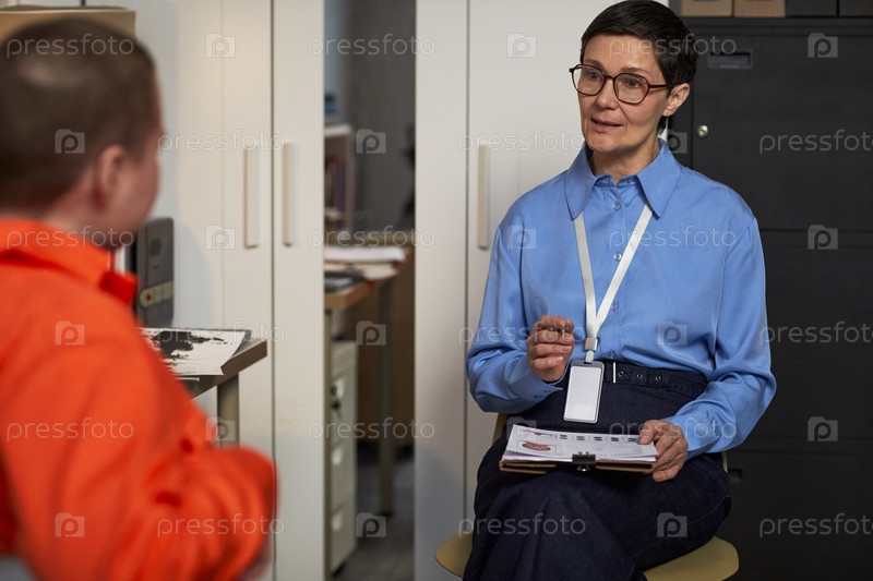 Женщина среднего возраста, интервьюирующая заключенного молодого взрослого мужчину в помещении