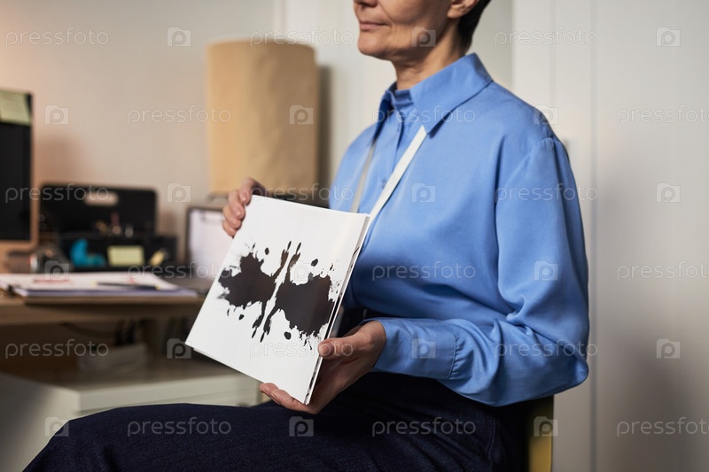 Женщина средних лет, держащая карточку теста Роршаха в тюремной обстановке