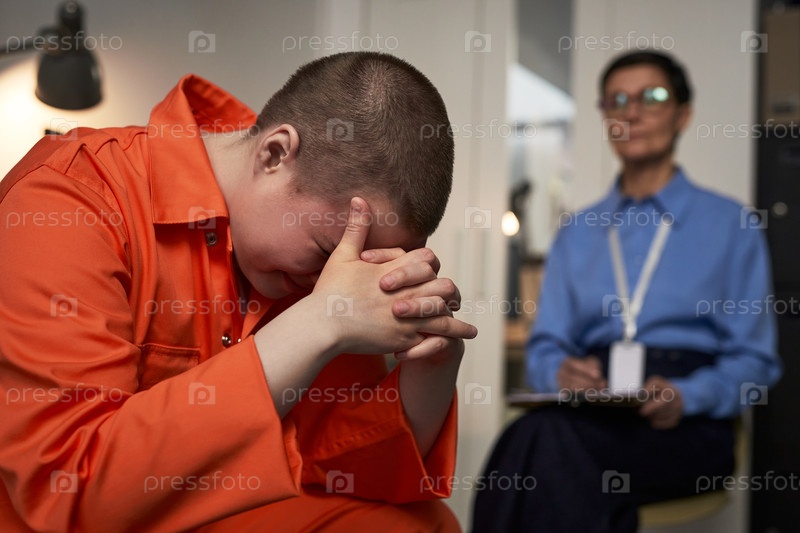Молодая взрослая женщина, сидящая в тюремной форме и чувствующая себя подавленно