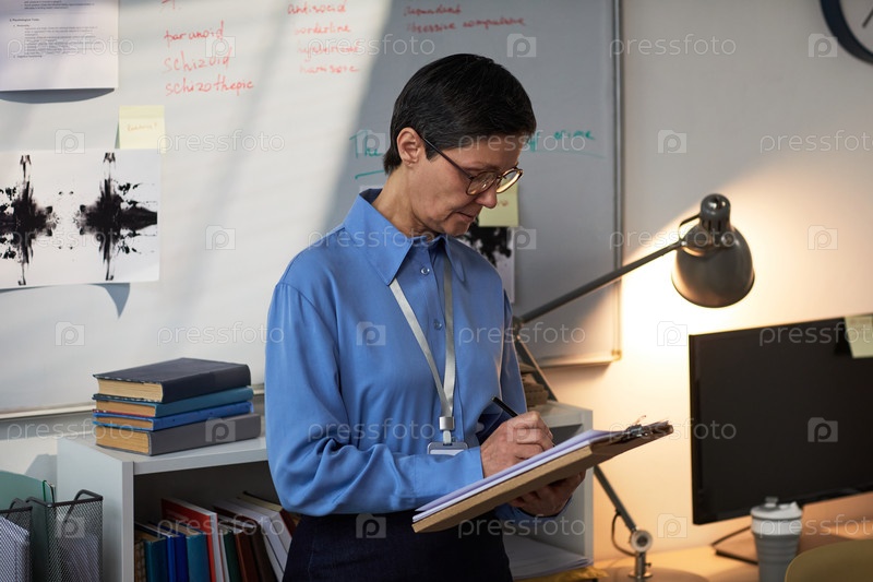 Женщина средних лет пишет заметки во время тюремной психологической оценки