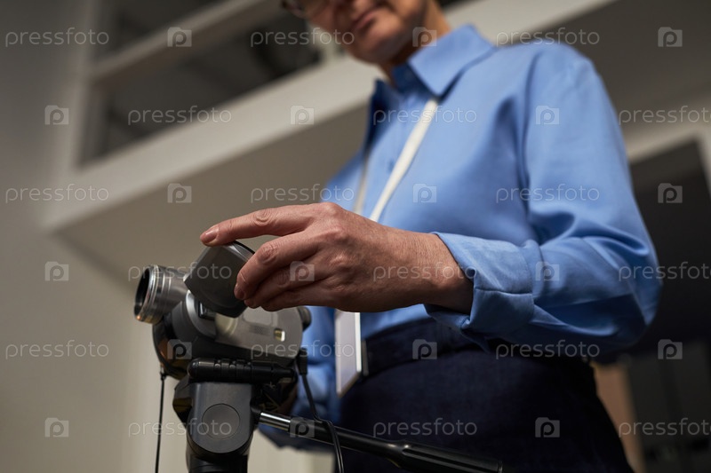 Женщина средних лет настраивает видеокамеру во время тюремной документации