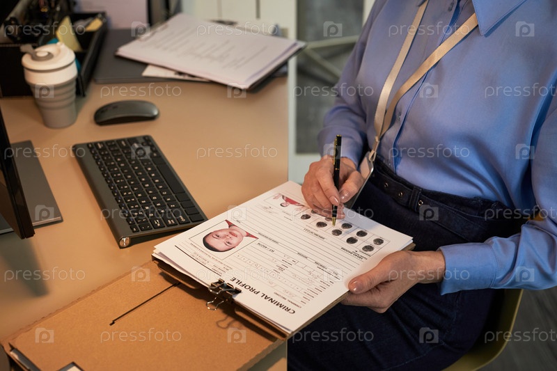 Женщина среднего возраста заполняет идентификацию отпечатков пальцев для заключенного
