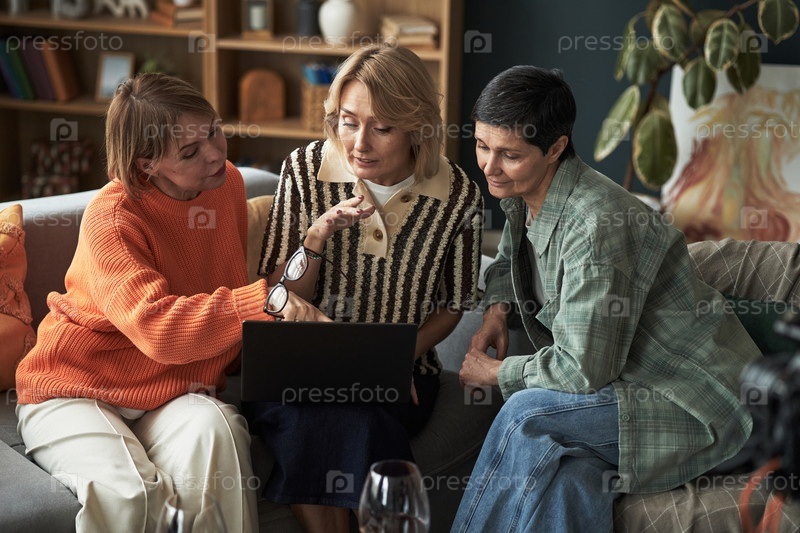 Женщины среднего возраста сидят вместе, используя ноутбук и разговаривая