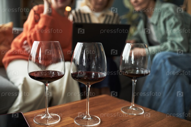 Молодые взрослые женщины, общающиеся и пьющие красное вино в помещении