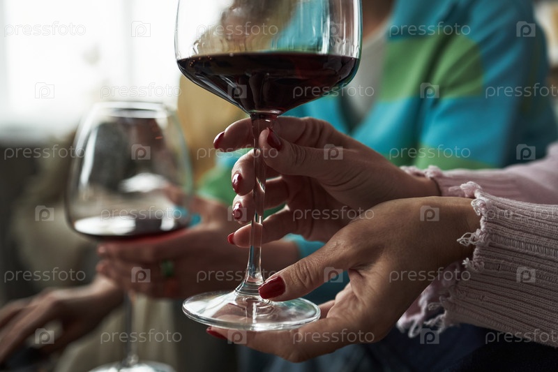 Молодые взрослые женщины расслабляются вместе, пьют красное вино в помещении