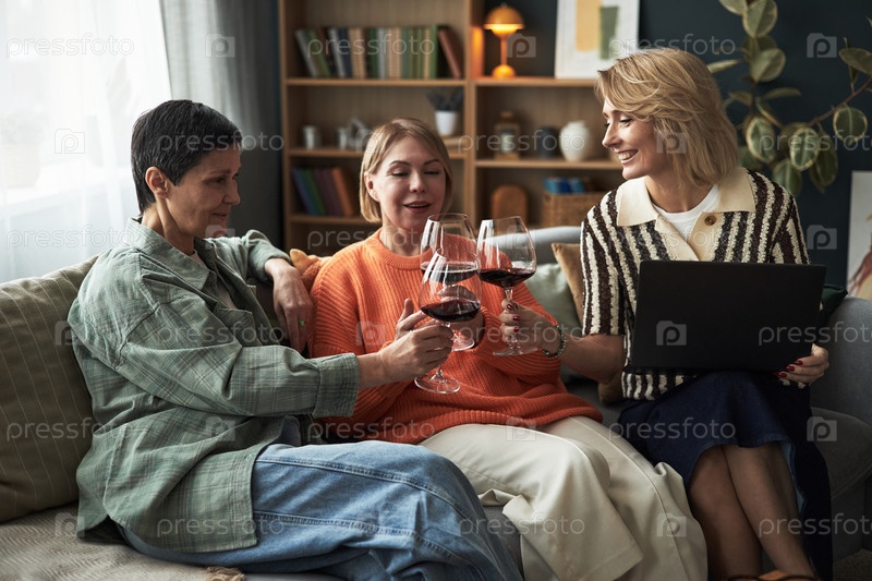 Группа женщин среднего возраста, выпивающих вино и улыбающихся вместе