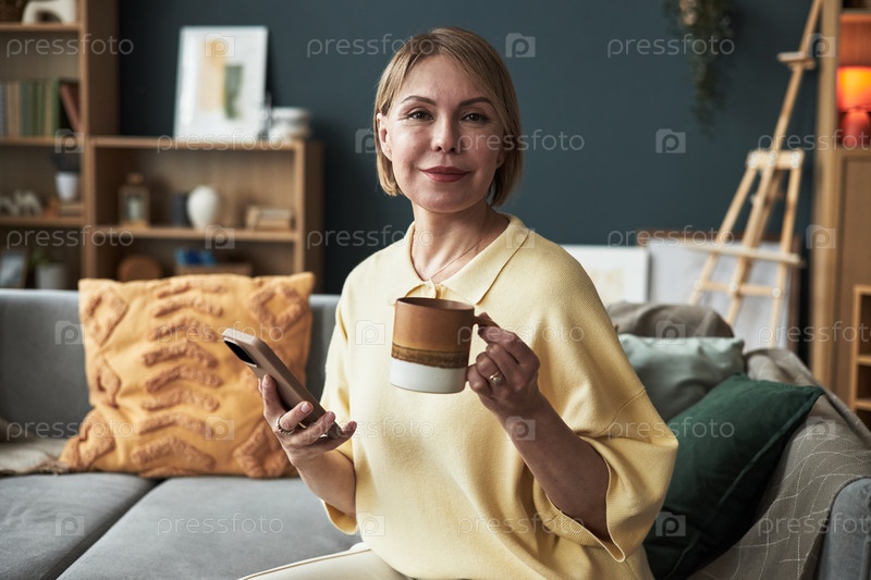 Портрет женщины среднего возраста, улыбающейся, держащей кружку и смартфон