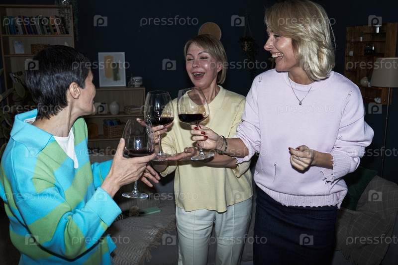 Женщины среднего возраста смеются вместе во время тостов на красное вино