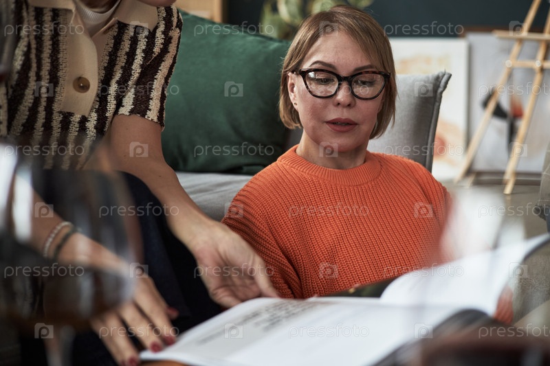 Женщины среднего возраста читают журнал вместе в уютной гостиной