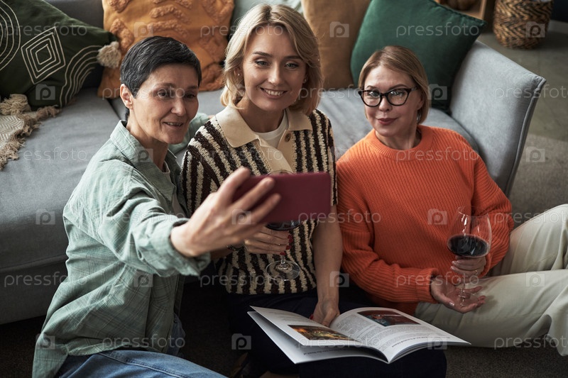 Женщины среднего возраста делают селфи и пьют вино в помещении