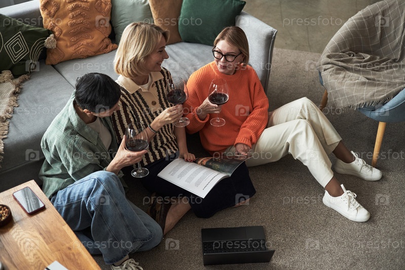 Молодые взрослые женщины сидят вместе, пьют вино и общаются