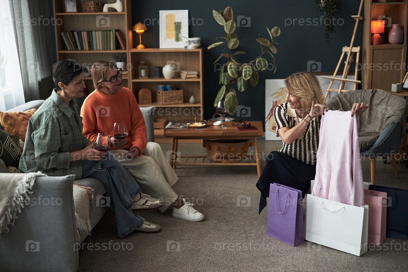 Женщины среднего возраста общаются и делятся опытом покупок в помещении