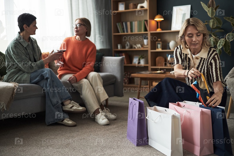 Женщины среднего возраста общаются и распаковывают сумки для покупок в помещении