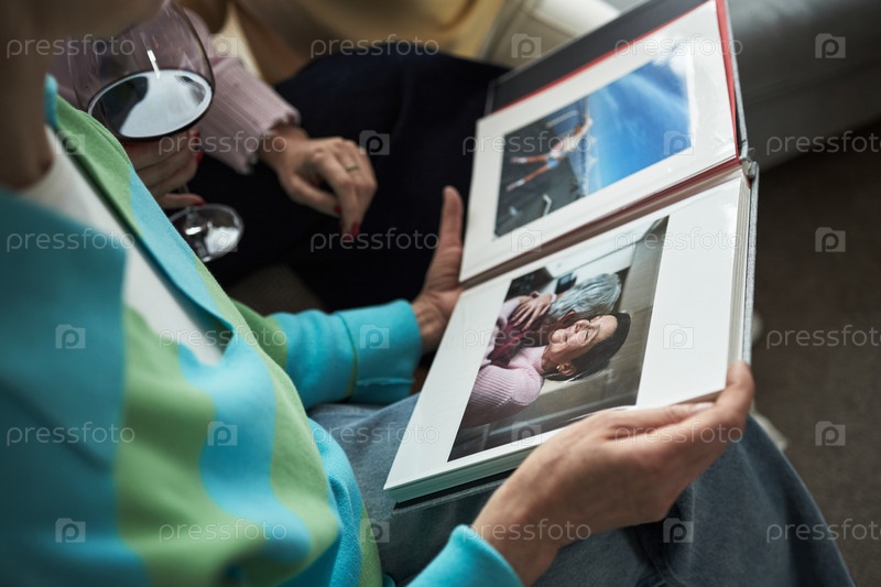 Женщины среднего возраста делятся воспоминаниями во время просмотра фотоальбома