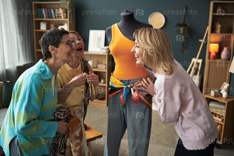 Три женщины среднего возраста смеются вместе, стилизуя манекен