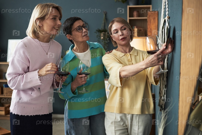 Женщины среднего возраста, которые вместе наслаждаются вином и общаются в помещении