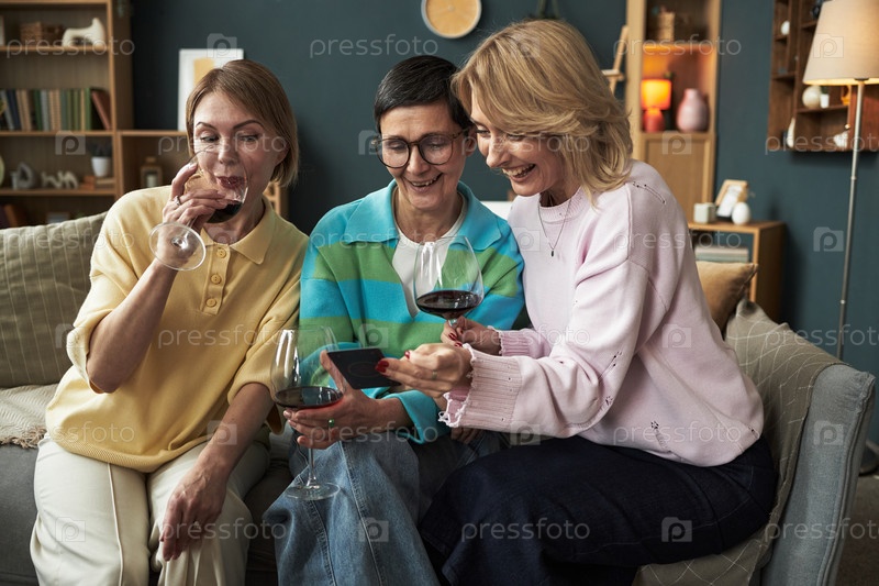 Три женщины среднего возраста смеются и пьют вино вместе в помещении