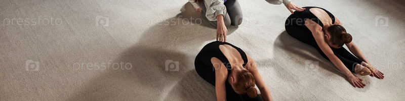 Подростки практикуют растяжение во время тренировки по ритмической гимнастике