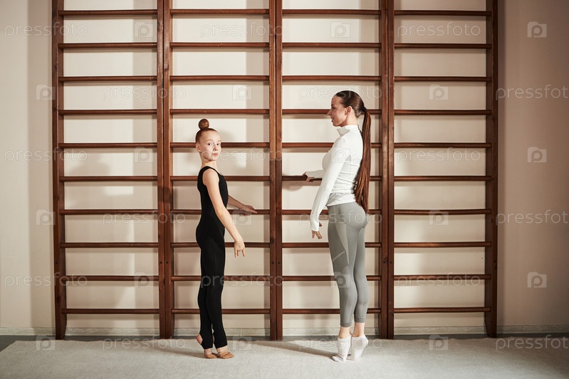 Женщина, обучающая девочку ритмической гимнастике