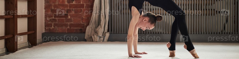 Девушка-подросток практикует спинный изгиб во время тренировки по ритмической гимнастике