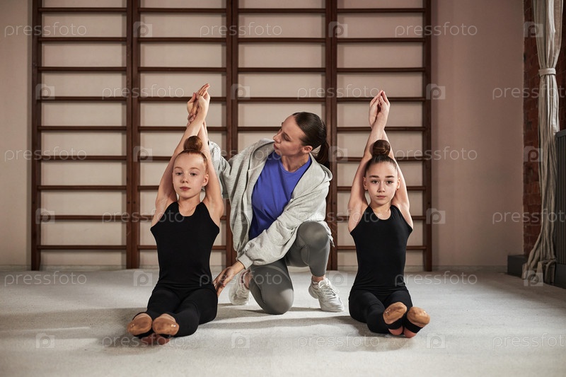 Женская тренерка направляет двух девушек, практикующих ритмическую гимнастику