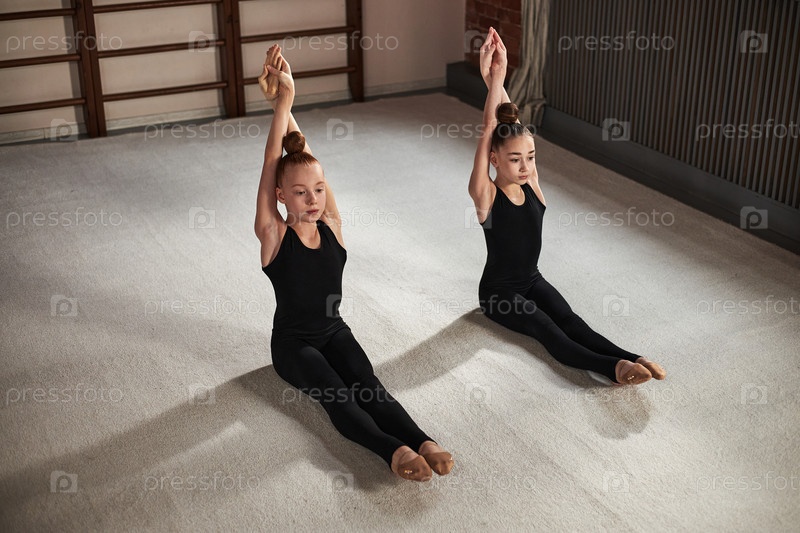 Две девочки практикуют упражнения по растяжению во время тренировки ритмической гимнастики