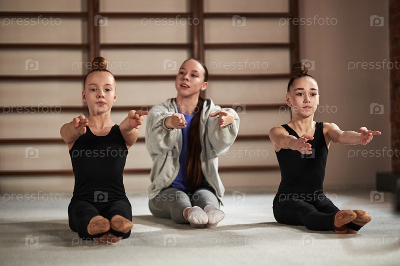 Девочки-подростки практикуют упражнения на растяжение с женским тренером в помещении