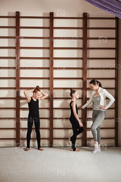 Женская тренерка обучает двух девочек в возрасте до 19 лет тренировкам по ритмической гимнастике