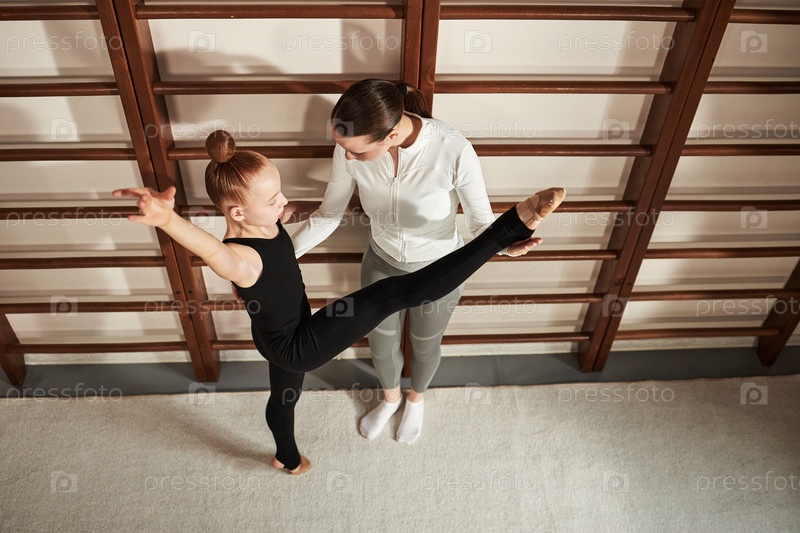 Ребенок-женщина практикует ритмическую гимнастику с тренером взрослой женщины