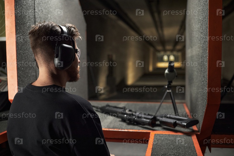 Молодой человек, носящий ушную защиту, практикуется на стрельбе