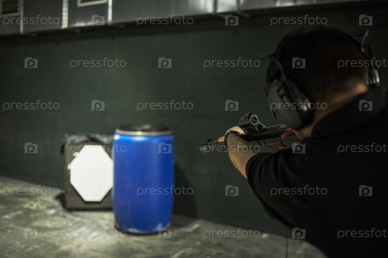 Клиент стреляет из винтовки в мужскую цель во время сессии клуба стрельбы