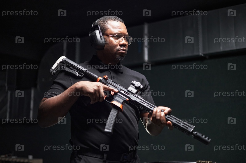 Чернокожий мужчина средних лет проверяет полуавтоматическую винтовку на стрельбе